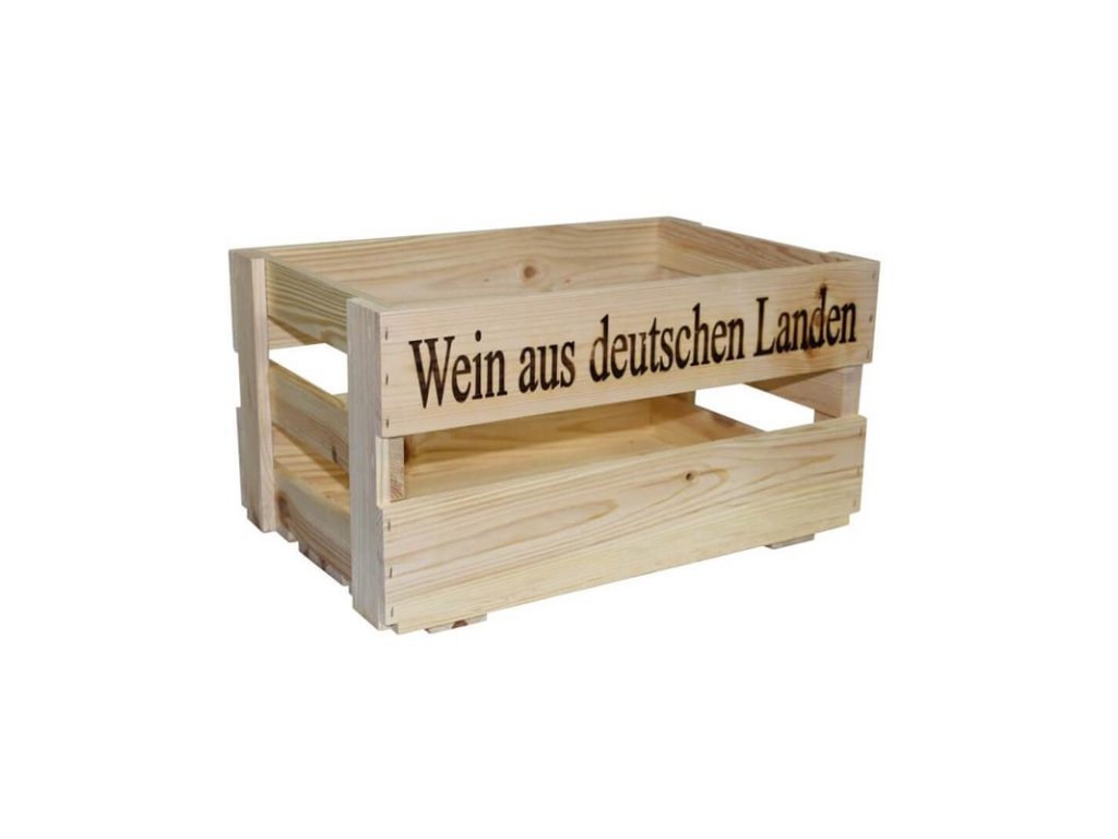 Dřevěná bedýnka s nápisem "Wein aus Deutschen Landen" je vhodná nejen pro uložení vín. Dřevo je přírodní materiál, který krásně voní a je šetrný k životnímu prostředí. Bedýnka je vyrobena z borovicového dřeva bez povrchové úpravy. Nosnost 24 kg.
