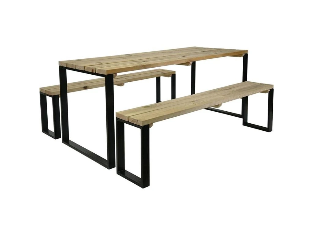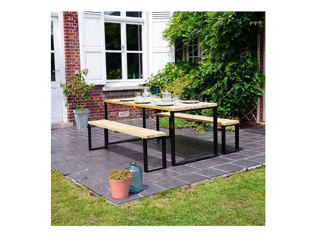 Sada zahradního nábytku kopíruje neotřelý, moderní design a zároveň splňuje požadavky na komfort sezení. Chcete-li sdílet svůj čas s rodinou nebo přáteli v srdci vaší zahrady nebo na terase, je tato sestava tou pravou volbou. Se svým kovovým podnožím ve tvaru písmene U a dřevěnou deskou těží tato zahradní sestava z industriálního stylu, který se skvěle hodí ke všem venkovním dekoracím.