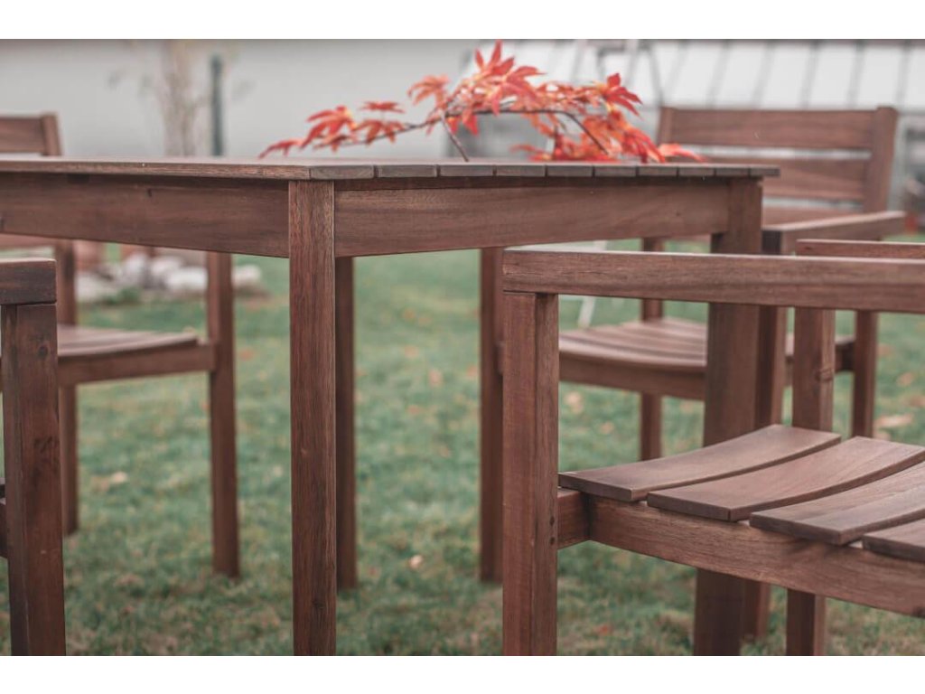 Povrchová úprava zahradního nábytku je provedena olejem, který chrání nábytek proti působení povětrnostních vlivů a přimořuje povrch na tmavý odstín. Dřevo je přírodní materiál, jeho kresba a zbarvení je na každém kusu nábytku unikátní. Nábytek je vyráběn tak, aby byl vhodný pro použití ve středoevropských podmínkách, přesto je nutné o něj pečovat a udržovat jej.