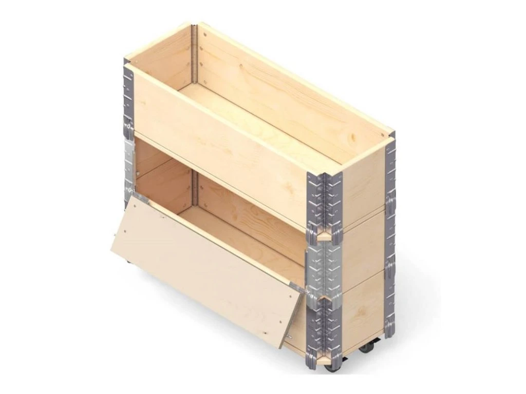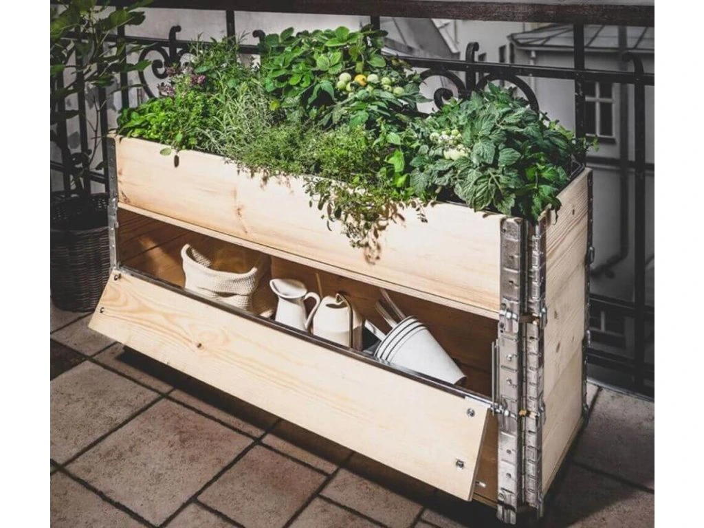 Vysoký záhon na bylinky opatřený kolečky a velmi praktickým úložným prostorem na zahradní nářadí. Vyrobeno z povrchově neupravené borovice. Stabilitu zajišťují kovové, spojovací rohy z pozinkovaného plechu.