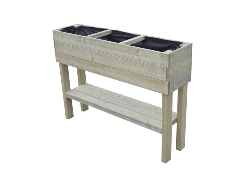 Praktický zvýšený záhon je vhodný pro každou zahradu, terasu nebo balkón. Jistě oceníte, že je záhon rozdělen na 3 květináčů. Velmi praktická je i spodní polička na odkádání pracovního nářadí a dalších potřeb. Je vhodný na pěstování například bylinek, zeleniny nebo květin. Dřevo je tlakově impregnováno proti plísním a houbám. Záhon je uvnitř opatřen agrotextilií. Agrotextilie udržuje půdní vlhkost během suchých období, je odolná vůči napadání plísněmi a bakteriemi, pohlcuje UV záření. Květináč je dodáván včetně této agrotextilie.